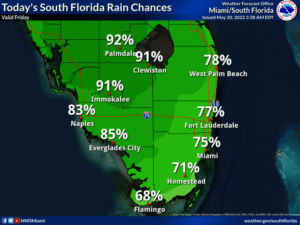Friday features clouds and showers in the morning and stormy periods in the afternoon and evening. After heavy rain overnight in much of Broward and Miami-Dade, additional rain will result in localized flooding. A moderate risk of dangerous rip currents is in place at the Atlantic beaches. Highs on Friday will be in the upper 80s in the east coast metro area and near 90 degrees along the Gulf coast.