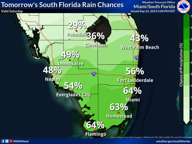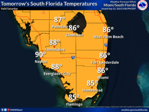 Saturday features lots of clouds and periods of storms in the east coast metro area. The Gulf Coast will see a mix of sun, clouds, and storms. A high risk of dangerous rip currents remains along the Palm Beach County coast, and there’s a moderate rip current risk at the beaches of Miami-Dade and Broward. Highs on Saturday will be mostly in the mid-80s in the East Coast metro area and near 90 degrees along the Gulf Coast and in the Keys.