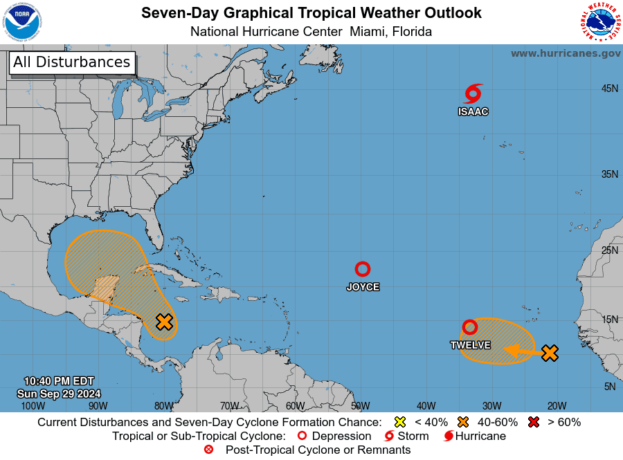 In the busy tropics, Isaac has weakened to a tropical depression in the northern Atlantic and is forecast to become post-tropical in a day or so. Joyce is weakening in the central Atlantic and is expected to become a remnant low on Tuesday — far from land. The low several hundred miles west of the Cape Verde Islands became Tropical Depression # 12 on Sunday as it continued to move westward, with a turn to the northwest anticipated soon. And a wave that recently emerged off the African coast has a medium chance of development.