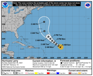 In the tropics, Hurricane Larry is bringing dangerous rip currents and rough surf to the Lesser Antilles.  At 5 am, Larry was located near 18.8 North, 49.0 West, about 1350 miles southeast of Bermuda.  Maximum sustained winds were 120 miles per hour, and Larry was moving northwest at 14 miles per hour.  Swells from Larry will create a rip current risk in much of the western Atlantic this week.