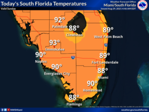 Monday will bring mostly sunny skies with passing showers and storms — in the mid to late afternoon along the Gulf coast and throughout the day in the east coast metro area. Monday’s highs will be in the low 90s.