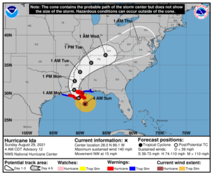 Hurricane Ida has intensified into a powerful category 4 hurricane. At 5 am, Ida was located near 28.0 North, 89.1 West, about 145 miles southeast of Houma, Louisiana. Maximum sustained winds were 140 miles per hour, and Ida was moving northwest at 15 miles per hour. A hurricane warning is in effect from Intracoastal City, Louisiana to the Pearl River (including the New Orleans area), and there are tropical storm warnings from Intracoastal City to Cameron, Louisiana and from the Pearl River to the Mississippi/Alabama border. The outer