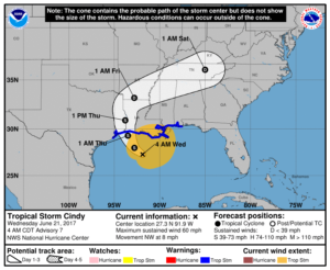 Tropical Storm Cindy formed in the Gulf of Mexico on Tuesday. It is bringing heavy rain and a threat of tornadoes to the northern Gulf coast well in advance of landfall late on Wednesday or early Thursday. At 5 am Wednesday, Cindy was located near 27.3 North, 91.9 West, about 225 miles southeast of Galveston, Texas. Maximum sustained winds were 60 miles per hour, and Cindy was moving northwest at 8 miles per hour. Cindy is a ragged system with much of the severe weather well to the east of the center. Effects from Cindy will be strongest from Louisiana to the Florida panhandle.