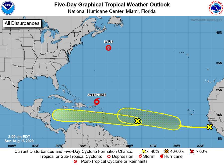 It’s really busy now in the tropics. We’ll start with the named systems, where there’s good news. Tropical Storm Josephine is losing steam north of the Leeward Islands. At 5 am on Sunday, Josephine was located near 20.3 North, 64.0 West, and was moving west-northwest at 15 miles per hour. Maximum sustained winds were 40 miles per hour, and Josephine is forecast to weaken more as it moves through an area of strong wind shear. Well to the north, Kyle has become extratropical in the open Atlantic. At 5 am Sunday, Kyle was about 545 miles southwest of Cape Race, Newfoundland. Maximum sustained winds were 40 miles per hour, and what’s left of Kyle will accelerate to the east before dissipating.