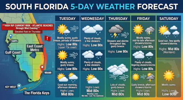 Thursday will feature lots of clouds and a gusty breeze throughout South Florida. The East Coast metro area and the Keys will also see showers and storms throughout the day, with some showers in the evening.  Expect an elevated risk of dangerous rip currents at the Atlantic beaches.  Thursday’s highs will be in the low 80s in the East Coast metro area and the Keys and in the mid-80s along the Gulf Coast.