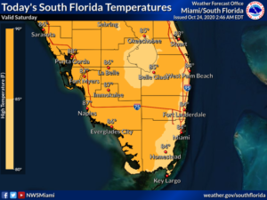 Saturday features sun and clouds in the morning, with showers and storms moving in during the afternoon and evening.  Heavy downpours are possible, and 2 to 4 inches of rain are possible this weekend into Monday.  A flood watch remains in effect through Sunday evening for the east coast metro area.  A high risk of dangerous rip currents remains at the Atlantic beaches through Sunday evening..  Highs on Saturday will be in the mid-80s in the east coast metro area and the upper 80s along the Gulf coast.