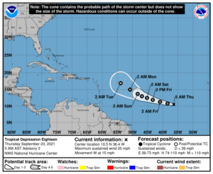 In the tropics, the wave in the eastern Atlantic is now Tropical Depression # 18. At 5 am, TD # 18 was located near 10.5 North, 36.4 West, about 1860 miles east-northeast of the northern Leeward Islands. Maximum sustained winds were 35 miles per hour, and TD # 18 was moving west at 15 miles per hour. TD # 18 is expected to become a hurricane during the next few days. We’ll continue to keep an eye on it.