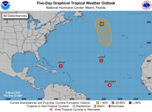 Elsewhere, remnants of Peter were about 260 miles north-northwest of San Juan, Puerto Rico at 5 am on Thursday. Rose is now a remnant low in the open Atlantic. And the remnants of Odette have a medium chance of redeveloping into a depression during the next few days.