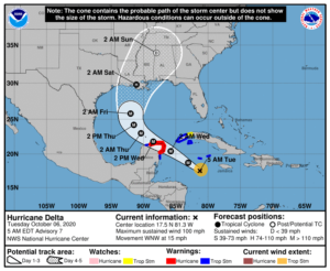 In the tropics, we now have Hurricane Delta in the western Caribbean. What had been a tropical depression 24 hours before had maximum sustained winds of 100 miles per hour at 5 am Tuesday. Delta was located near 17.5 North, 81.3 West (about 420 east-southeast of Cozumel, Mexico) at 5 am on Tuesday. Delta was moving west-northwest at 15 miles per hour. Hurricane warnings are up for Cozumel and portions of the Yucatan coast, and tropical storm warnings are in effect for the Cayman Islands and portions of western Cuba. Delta is forecast to become a major hurricane as it reaches the northern Yucatan early on Wednesday. A second landfall is expected along the Gulf coast anywhere from extreme eastern Texas to the western portion of the Florida panhandle late on Friday or early Saturday.