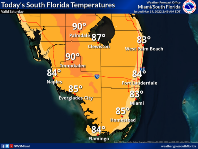 Monday will feature lots of sun along the Gulf coast, while the east coast metro area will see good sun and some clouds on a brisk and gusty ocean breeze.  Monday’s highs will be near 80 degrees in the east coast metro area and in the mid-80s along the Gulf coast.