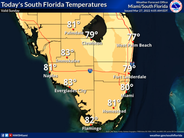Wednesday will feature a strong and gusty breeze with lots of sun and maybe a cloud or two at times. Wednesday‘s highs will be mostly in the mid-80s in the east coast metro area and in the upper 80s along the Gulf coast.