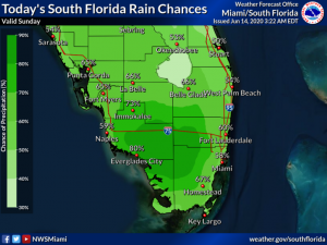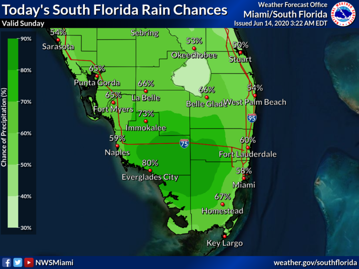 Sunday features lots of clouds and periods of showers and storms, especially during the afternoon and evening. A moderate risk of dangerous rip currents is in place at the Atlantic beaches. Highs on Sunday will be in the mid 80s near the east coast and the upper 80s elsewhere.