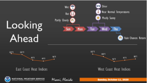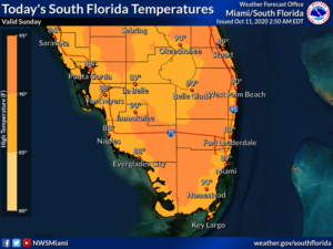The Columbus Day holiday will start with good sun, and then showers and a few storms will develop in the afternoon, especially in the east coast metro area. Monday’s highs will be near 90 degrees in the east coast metro area and the upper 80s along the Gulf coast.