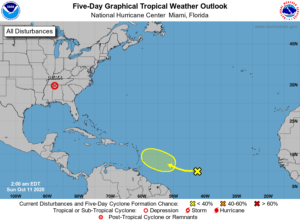 In the tropics. the remnants of Delta continue to bring rain to the Tennessee River Valley. Elsewhere, the wave in the central Atlantic has a low chance of becoming a depression in the next few days, and then upper level winds are expected to limit any development.