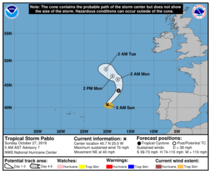 In the tropics, Tropical Storm Pablo is stronger as it zooms away from the Azores. At 5 am Sunday, Pablo was located near 40.7 North, 20.0 West, about 400 miles east-northeast of the Azores. Maximum sustained winds were 70 miles per hour, and Pablo was racing northeast at 40 miles per hour. Pablo is forecast to slow down and weaken later on Sunday and become a post-tropical system on Monday.