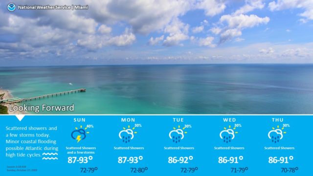 Sunday features a few very early east coast showers, followed by good sun in the morning and early afternoon. Then look for showers and storms to pop up, mostly in the late afternoon and early evening. Coastal flooding around high tides is expected along the Atlantic coast on Sunday. Highs on Sunday will be in the upper 80s.