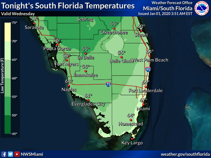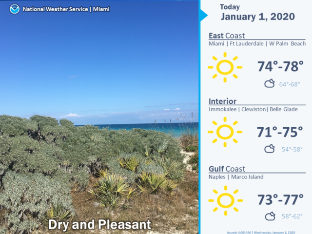 After a cool start with lows ranging from the mid 50s to the low 60s, Wednesday features blue skies and lots of sun. Highs on New Year’s Day will top out in the mid 70s.