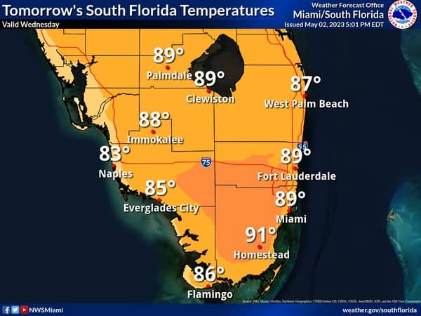 Wednesday features pleasant morning temperatures, lots of sun, just a few clouds, and dry conditions around South Florida. A moderate risk of dangerous rip currents remains along the Palm Beach County coast — with the rip current risk decreasing elsewhere. Highs on Wednesday will be mostly in the upper 80s in the east coast metro area and in the mid 80s along the Gulf coast and in the Keys.