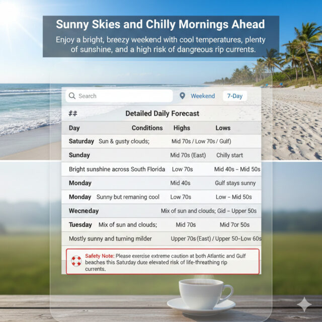 Sunday will bring morning lows in the mid-40s to mid-50s on the mainland. Then we’ll see sunny skies around South Florida. Sunday’s highs will be in the low 70s.
