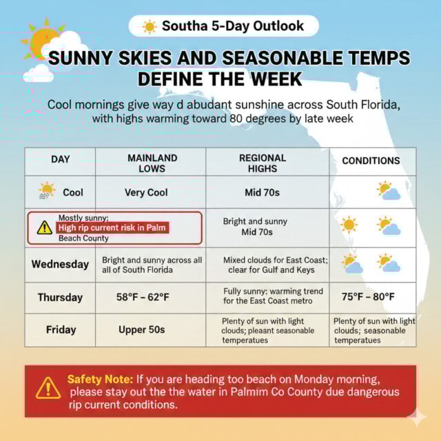 Thursday morning lows will be mostly in the upper 50s on the mainland.  The day will be sunny throughout South Florida.  Thursday’s highs will be near 80 degrees in the East Coast metro area, in the mid-70s along the Gulf Coast, and in the Keys.