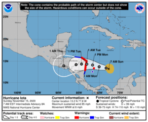 In the tropics, Iota is now a hurricane on its way to the portion of Central America already devastated by Eta. At 4 am Sunday, Iota was located near 13.1 North, 77.3 West, about 275 miles east of Isla de Providencia, Colombia. Maximum sustained winds were 80 miles per hour, and Iota was moving west at 6 miles per hour. Hurricane warnings are in effect for Providencia and portions of Nicaragua and Honduras. Iota is forecast to be a major hurricane when it approaches the coast of Central America on Monday into Tuesday.