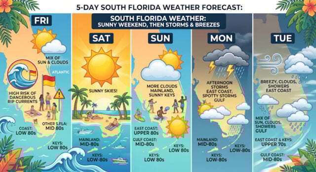 Sunday will feature more clouds than sun on the mainland and mostly sunny skies in the Keys. Sunday’s highs will be mostly in the upper 80s on the East Coast, in the mid-80s along the Gulf Coast, and in the low 80s in the Keys.