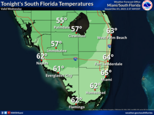 Wednesday features a cool morning but then lots of sun will make for a pleasant start to the month of December.  A high risk of dangerous rip currents remains along the Palm Beach County coast, and there’s a moderate rip current risk at the beaches of Miami-Dade and Broward.  Highs on Wednesday will be mostly in the upper 70s in the east coast metro area and near 80 degrees along the Gulf coast.