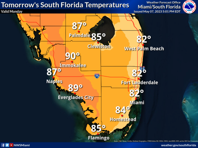 Wednesday will feature a mix of sun and clouds in the east coast and in the Keys, while the Gulf Coast will be sunny again. Look for passing showers in the east coast metro area and a few afternoon storms along the Gulf Coast. Wednesday’s highs will be mostly in the low 90s in the east coast metro area, near 90 degrees along the Gulf Coast, and in the mid-80s in the Keys.