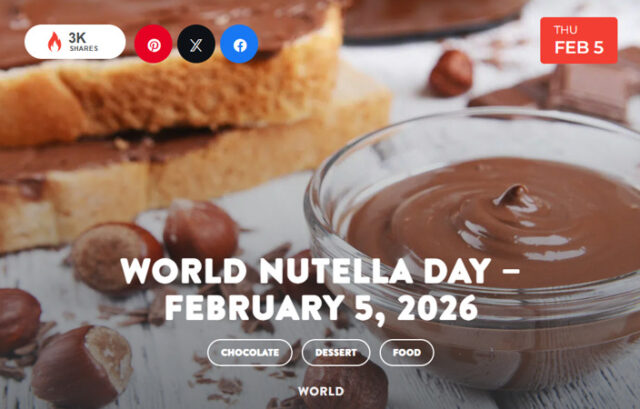 World Nutella Day celebrates what happens when hazelnuts and chocolate collide. For example, millions of people celebrate on February 5th each year! 2024 is the 60th anniversary.