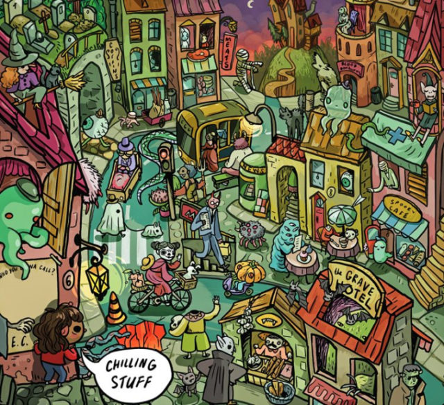 The images feature a number of hidden ghosts and ghouls, from zombies and vampires to witches and monsters.