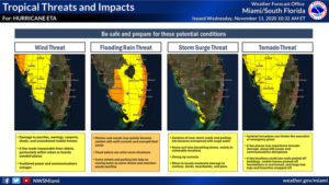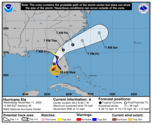 A tornado watch is in effect for Collier County, including the Naples area, until 5 pm Wednesday.  The southwest Gulf coast is dealing with outer bands of Hurricane Eta, which was located about 115 miles west-southwest of Port Charlotte at 10 am on Wednesday.  The Naples area can expect very gusty winds, periods of heavy rain, and possible flash flooding on Wednesday into Thursday as Eta moves up the Florida Gulf Coast.