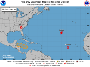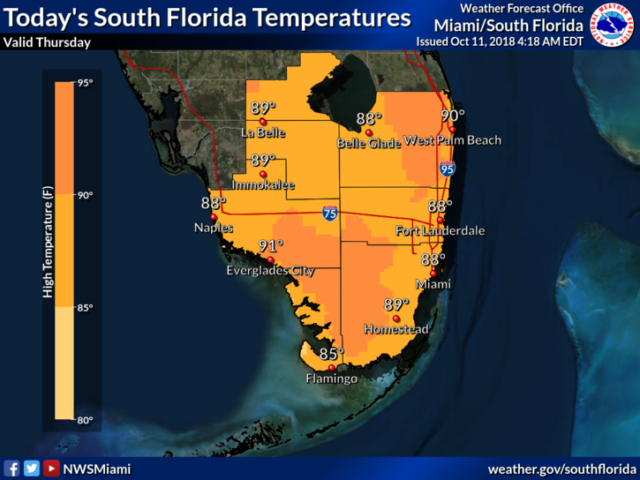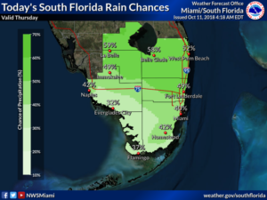 South Florida will be hot and tropical on Thursday, with showers and storms around. The day features showers and storms on the Gulf coast (leftover moisture from Michael), followed by periods of afternoon showers and storms. A moderate risk of dangerous rip currents is in place at the Gulf beaches, and low-lying portions of the Gulf coast will see minor tidal flooding. Highs on Thursday will be in the upper 80s right along the coasts but the low 90s everywhere else.Friday will bring sun, clouds, and periods of showers and storms as we remain in the moisture “tail” of Michael. Friday’s highs will be near 90 degrees.