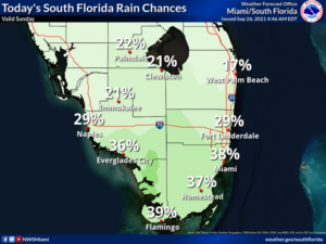Sunday features partly sunny skies with periods of showers in the east coast metro area, while the Gulf coast will enjoy lots of sun with just a few late afternoon showers..  A moderate risk of dangerous rip currents remains along the Palm Beach County coast.  Highs on Sunday will be in the upper 80s in the east coast metro area and the low 90s along the Gulf coast.