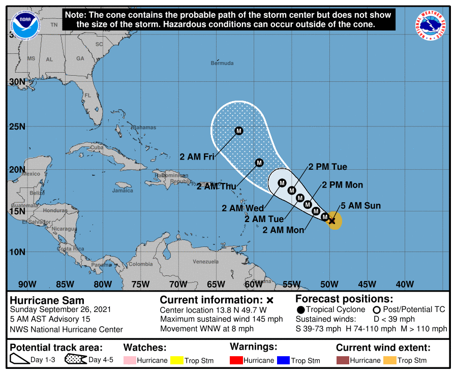 In the tropics, Hurricane Sam is now a powerful major hurricane.  At 5 am, Sam was located near 13.8 North, 39.7 West, about 940 miles east-southeast of the northern Leeward Islands.  Maximum sustained winds were 145 miles per hour, and Sam was moving west-northwest at 8 miles per hour.  There are no watches and warnings at this time, and Sam is forecast to make a northwesterly and then northerly turn in the days ahead, keeping it far from the Bahamas and Florida.