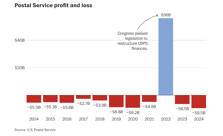 “The government is slow, slow, slow — decades slow on adopting new ways of doing things, and there’s a lot of [other] carrier services that became legal in the ’70s that are doing things so much better with increased volumes and reduced costs,” said Casey Mulligan, who served as a top economist in the first Trump administration. “We didn’t finish the job in the first term, but we should finish it now.”