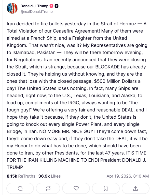 - The Washington Post: “Trump says Iran talks will resume, threatens power plants and bridges if no deal” (April 19, 2026) https://www.washingtonpost.com/world/2026/04/19/trump-iran-war-hormuz-strait-negotiations/