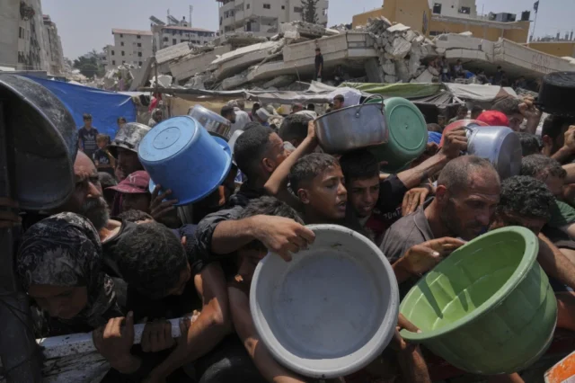 Palestinians struggle to get donated food at a community kitchen, in Gaza City, northern Gaza Strip, Saturday, July 26, 2025. (AP Photo/Abdel Kareem Hana)