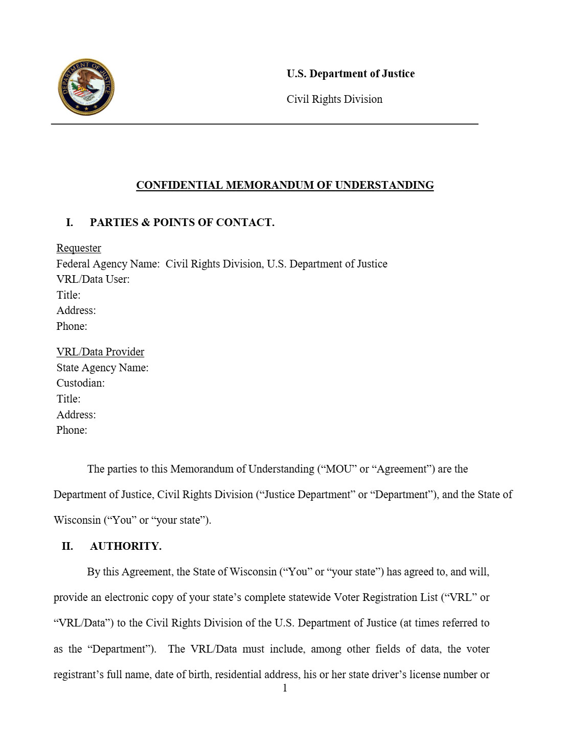 The agreement — called a memorandum of understanding, or MOU — would hand the federal government a major role in election administration, a responsibility that belongs to the states under the U.S. Constitution.