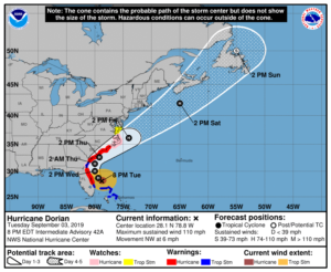 At 8 pm, Dorian was located near 28.1 North, 78.8 West, about 110 miles east of Cape Canaveral. Maximum sustained winds were 110 miles per hour. Dorian was moving northwest at 6 miles per hour.
