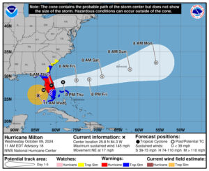 At 11 am, Milton was about 190 miles southwest of Tampa and 160 miles west-southwest of Ft. Myers. Maximum sustained winds were 145 miles per hour, making Milton a dangerous category 4 hurricane. Milton was moving northeast at 17 miles per hour.