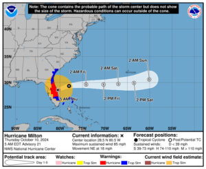At 5 am Thursday, Milton was about 10 miles northeast of Cape Canaveral.  The hurricane was moving northeast at 18 miles per hour.  Maximum sustained winds were 85 miles per hour — so Milton maintained hurricane strength during its entire trek across central Florida.