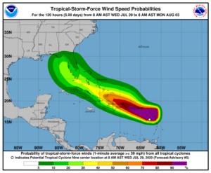 Until a closed circulation and a well-defined center form, the track of Potential TC # 9 is more uncertain than usual. We’ll have to watch for that and for the effects of mountainous terrain in Hispaniola on the development of this system. The midday computer model runs, however, have shifted somewhat to the west, so the Gulf Coast and the Lower and Middle Keys could be near the center of this developing system. The worst of the weather remains on the northeastern portion of this system, so much of Florida will feel some impacts this weekend into Monday.