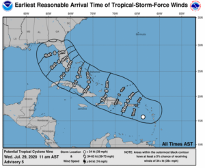 Potential TC # 9 is bringing heavy rain and gusty winds to the Leeward Islands at midday on Wednesday, and it will affect the Virgin Islands and Puerto Rico Wednesday afternoon through Thursday morning. The system will then move over or very near Hispaniola on Thursday and then affect the Turks and Caicos and the southeastern Bahamas later in the day.