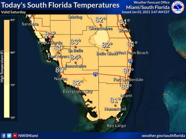 Sunday morning will see some patchy fog again.  Then we’ll see a mix of sun and clouds along with a few Gulf coast showers as a front approaches.  Sunday’s highs will be in the low 80s in the east coast metro area and the upper 70s along the Gulf coast.
