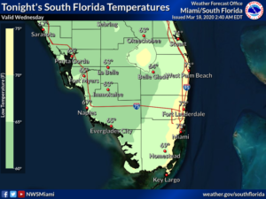 Wednesday features some Gulf coast clouds to start, giving way to mostly sunny skies throughout South Florida. Look for a strong ocean breeze along the east coast. There’s a high risk of dangerous rip currents along the Palm Beach County coast, and the rip current risk is moderate in Miami-Dade and Broward. Highs on Wednesday will be in the low 80s right at the Atlantic coast and in the mid-80s.