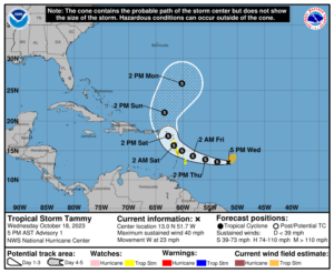 In the tropics, the wave in the central Atlantic became Tropical Storm Tammy late Wednesday afternoon. At that time, Tammy was about 625 miles east of the Windward Islands and was moving west at 23 miles per hour. Maximum sustained winds were 40 miles per hour, and some strengthening is forecast before Tammy reaches the islands on Friday. There are tropical storm watches for Barbados, Dominica, and Martinique and Guadeloupe as of Wednesday night, and additional watches and warnings are expected. Tammy is forecast to bring tropical storm force winds, up to 10 inches of rain in some locations, flooding and possible mudslides, as well as dangerous surf conditions and potentially deadly rip currents. Tammy is expected to turn to the north on Sunday, well to the east of the Bahamas.Disclaimer