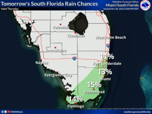 Thursday features plenty of sun, a few clouds at times, and maybe a stray shower in spots in the East Coast metro area. The Gulf Coast will be sunny. Look for an elevated risk of dangerous rip currents at the Atlantic beaches, especially along the Palm Beach County coast. Highs on Thursday will be in the mid-80s.Friday will bring mostly sunny skies with just the chance of an East Coast shower. Expect the elevated rip current risk to continue at the Atlantic beaches. Friday‘s highs will be in the mid-80s.