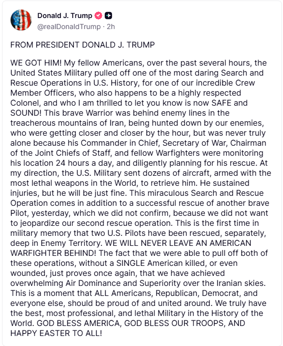 The news of the successful extraction was first shared by President Donald Trump via a series of celebratory posts on Truth Social shortly after midnight on Easter Sunday.
