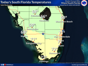 Wednesday features more clouds and periods of showers as cooler air moves in. A high risk of dangerous rip currents remains along the Palm Beach County coast, and there’s a moderate rip current risk at the Broward and Miami-Dade beaches. Highs on Wednesday will be in the low 70s in the east coast metro area and near 70 degrees along the Gulf coast.