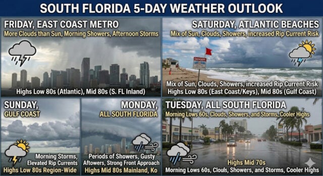 Friday features more clouds than sun, morning showers, and periods of storms in the afternoon on the East Coast metro area as a front moves in. The Gulf coast will see a mix of sun, clouds, a few showers in the morning, with storms developing in the afternoon. The Keys will see plenty of clouds and some showers. Friday’s highs will be in the low 80s right at the Atlantic coast and in the Keys, while the rest of South Florida will top out in the mid 80s.